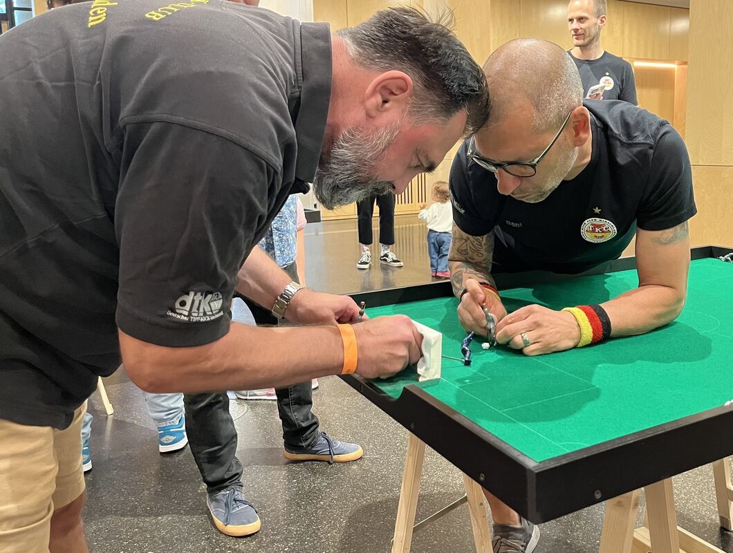 Etwa 40.000 Spiele verkauft Mieg pro Jahr. In Jahren einer EM oder WM sind es 60.000 oder mehr. Liegt der Umsatz normalerweise bei etwa einer Million Euro, so erwartet Mathias Mieg dieses Jahr rund 1,5 Millionen Euro. Zur weiteren Verbreitung könnte beitragen, dass Tipp Kick längst auch ein Wettkampfsport ist. Mit dem Tipp-Kick-Club 71 Hirschlanden sitzt der bundesweit mit Abstand erfolgreichste Verein im Landkreis Ludwigsburg. Profis wie der mehrfache Deutsche Meister Benjamin Buza setzen Spezialanfertigungen ein. Die Schussbeine sind mit speziellen Gleitlagern ausgestattet. Zudem variiert die Fußform – je nachdem, welche Schusstechnik den größten Erfolg verspricht. Für solche Einzelanfertigungen werden dann schon mal bis zu 200 Euro pro Männchen fällig. So tief muss ein Normalverbraucher nicht in die Tasche greifen. Das Jubiläumsspiel zum 100-jährigen Bestehen mit den klassischen Heim- und Auswärtstrikots des DFB aus den 1970er Jahren in weiß-schwarz und grün-weiß kann man schon für 50 Euro haben. (GEA)