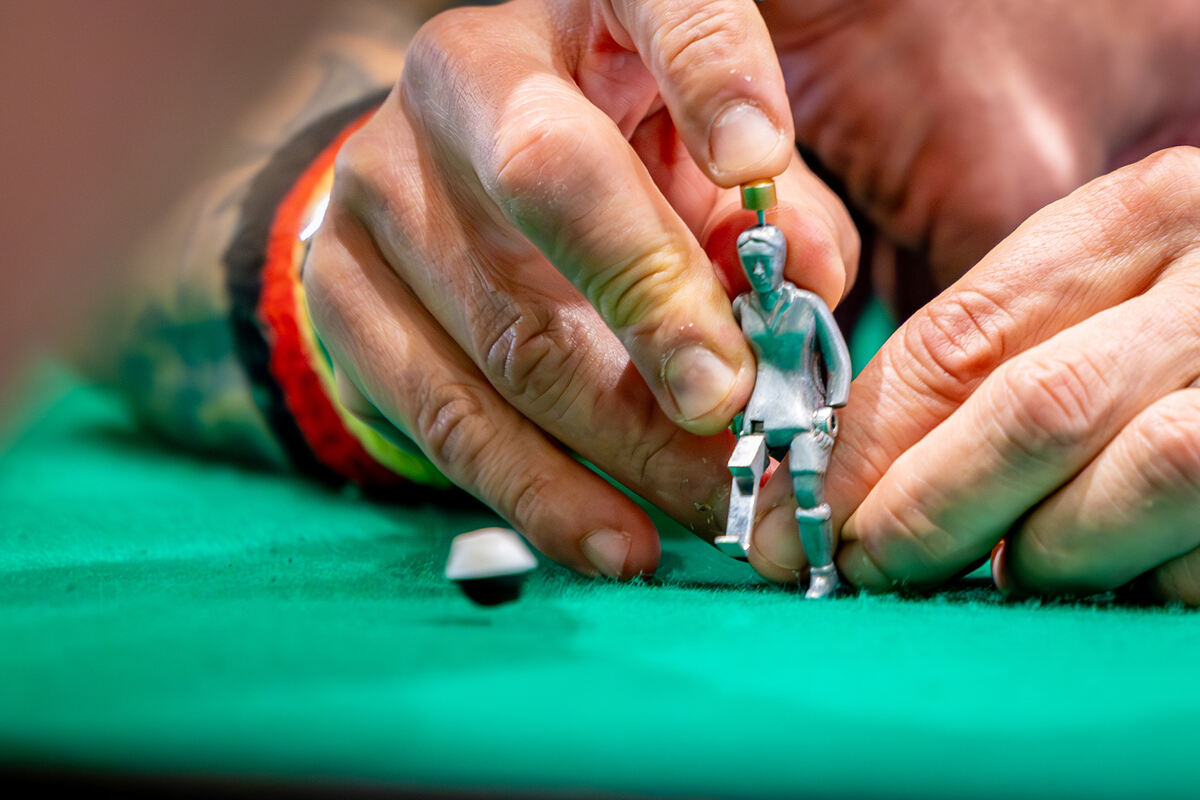 Die Renner sind die Kicker in den Trikots von Bayern München und Borussia Dortmund. Gleich danach folgt der VfB, sagt Mieg stolz und nicht ohne Lokalpatriotismus. Solche großen Serien werden aus Kostengründen seit 2016 in China produziert. In Schwenningen arbeiten noch vier Frauen und zwei Männer als Maler. Kleinere Auflagen – wie etwa für den FC Heidenheim oder Sonderbestellungen von Unternehmen mit Spielern in ihren Firmenfarben – werden in der Mieg-Zentrale fertig gestellt. Die Rohlinge kommen zwar ebenfalls aus China. Doch bunt werden sie erst im Werk in Schwenningen. »Man braucht eine ruhige Hand und viel Geduld, bis man die Männchen schnell und gut anmalen kann«, erklärt Mieg. Die Minijobber werden nach Stückzahl bezahlt. Also lohnt es sich für die Mitarbeiter, fix zu produzieren. Zuerst wird nur die Hose oder das Trikot bemalt. Das erste Teil muss dann etwa eine halbe Stunde trocknen, bevor das zweite Teil an der Reihe ist.