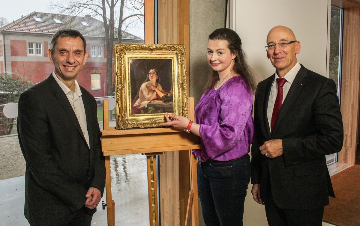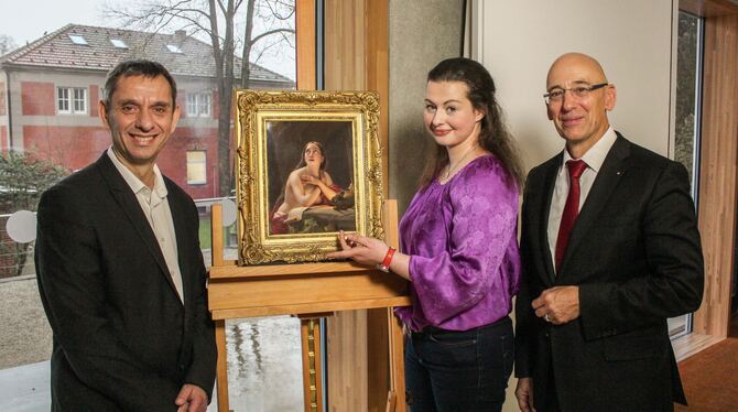 Thomas Kölpin (links), Konservatorin Patricia Peschel und Michael Hörrmann, Geschäftsführer der Staatlichen Schlösser und Gärten. FOTO: GEA
