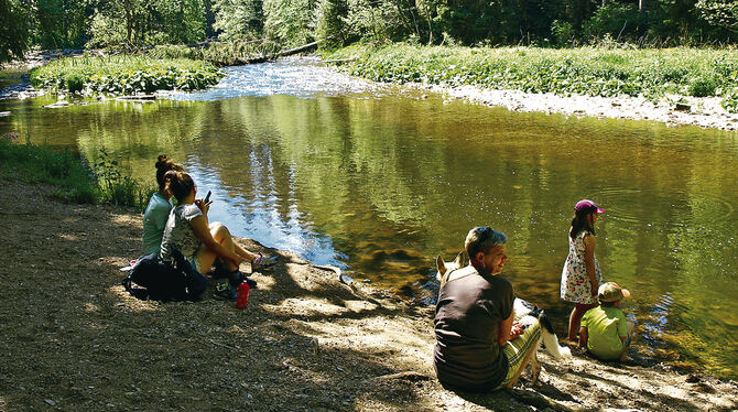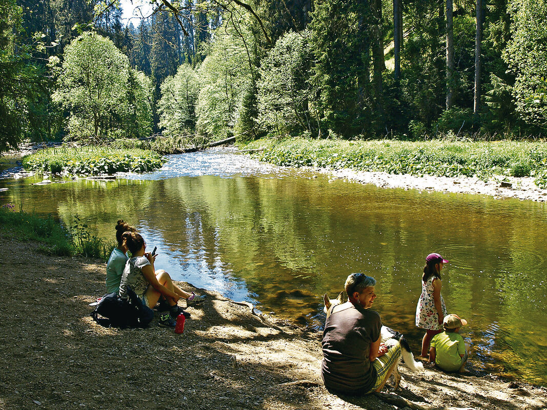 Die Mündung des Rötenbaches in die Wutach bietet ausreichend Platz für rastende Wandergruppen. Hier und da wird gevespert, bevor es weiter entlang der Wutach geht.