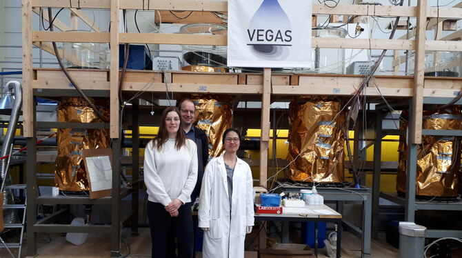 Das Vegas-Team im Laborcontainer der Universität Stuttgart (von links nach rechts): Anna Burkhardt, Claus Haslauer und Hue Nguyen.