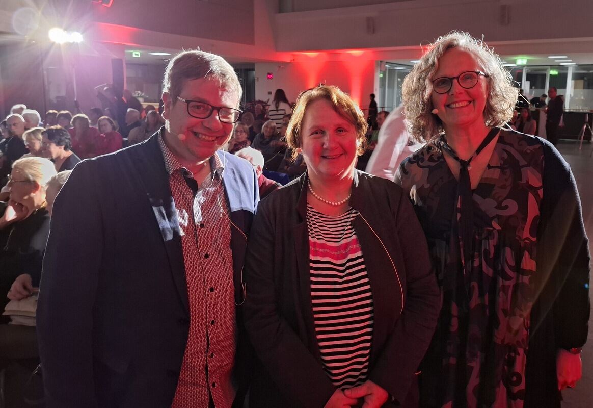 Kultusministerin Theresa Schopper (Mitte) wurde am Dienstag von Dr. Stefan Meißner und Dr. Claudia Guggenmos, beide Katholisches Bildungswerk Reutlingen, in der Reutlinger Kreissparkasse interviewt.