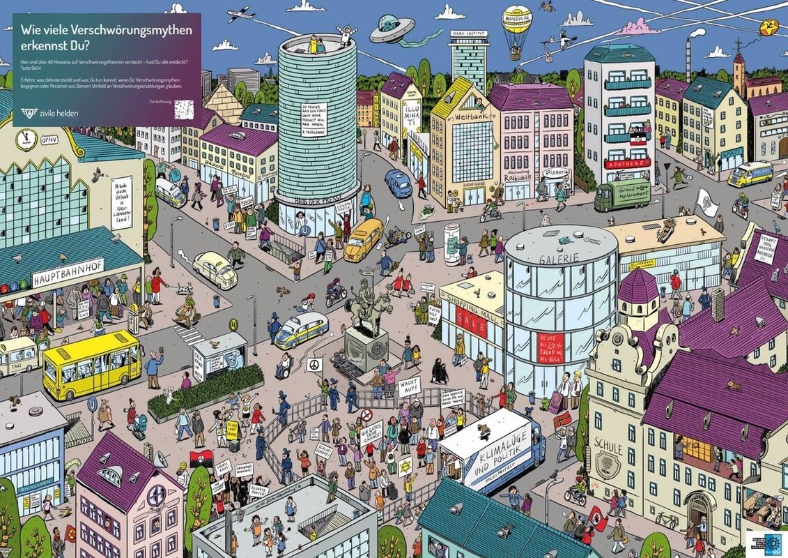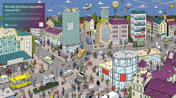 STUTTGART. Das Landeskriminalamt Baden-Württemberg (LKA BW) hat in Zusammenarbeit mit dem Programm Polizeiliche Kriminalprävention der Länder und des Bundes ein digitales und interaktives Wimmelbild entwickelt. Dabei können in einer Stadtkulisse Verschwörungsmythen auf Jacken, Plakaten und Hauswänden entdeckt werden, deren Bedeutung beim Anklicken erklärt wird.