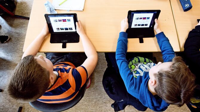Schüler einer 5. Klasse lernen mit iPads im Englischunterricht. FOTO: STRATENSCHULTE/DPA