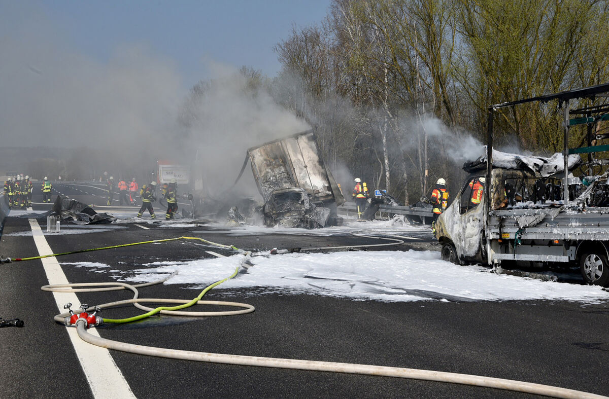 Wie der Sprecher sagte, bot sich an der Unfallstelle ein unübersichtliches Bild. Der Fahrer eines Transporters hatte am Vormittag nahe Dielheim (Rhein-Neckar-Kreis) die Spur gewechselt und dabei ein Auto gerammt. Der Wagen wurde durch die Wucht des Aufpralls unter einen vorausfahrenden Sattelzug geschoben. Alle drei Fahrzeuge brannten vollständig aus.