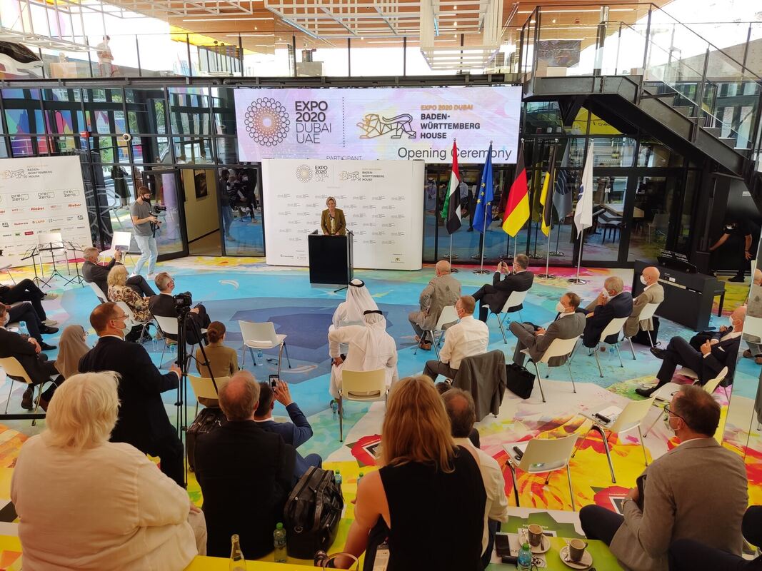Eröffnungszeremonie mit Wirtschaftsministerin Nicole Hoffmeister-Kraut (am Rednerpult) im Baden-Württemberg Pavillon.