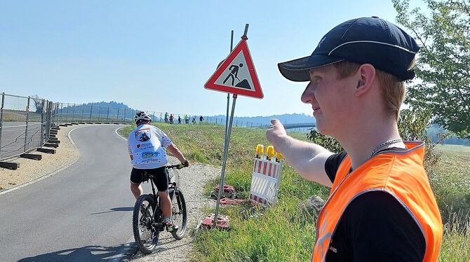 Das kann schnell schiefgehen: An heiklen Punkten wie hier in Allensbach werden Kadetten eingesetzt, um Radlern den Weg zu weisen. FOTO: FRICKER