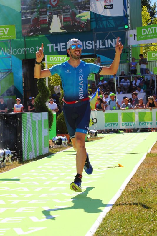Sören Michelsburg beim Zieleinlauf beim Long-Distance-Triathlon in Roth, den er in etwas mehr als 9 Stunden absolvierte. Nächstes Ziel: Der OB-Sessel in Heidelberg. FOTO: PRIVAT