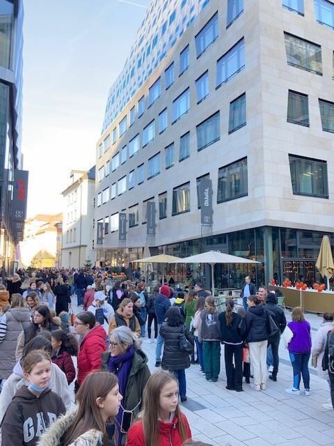 Jugendliche warten in einer langen Schlange auf ein Autogramm.