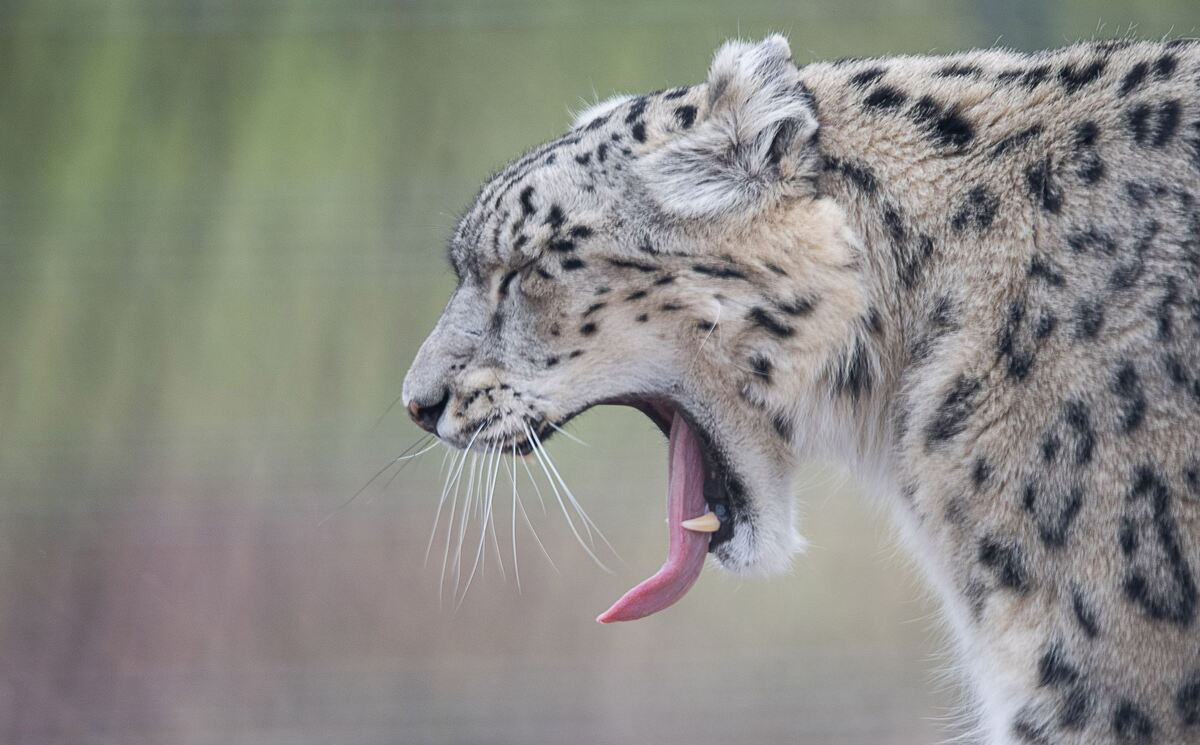 Schneeleopardin Kailash gähnt während der Eröffnung der neuen Schneeleopardenanlage im Stuttgarter Zoo Wilhelma.