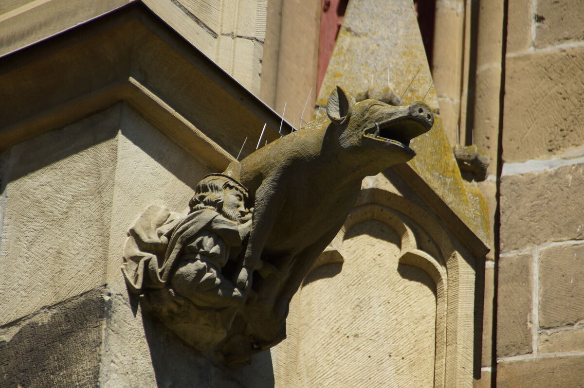 Antisemitischer Wasserspeier an der Ritterstiftskirche in Bad Wimpfen.