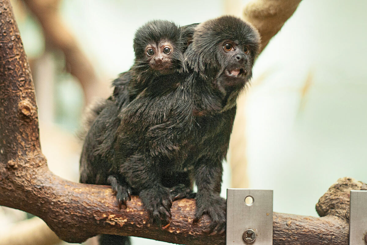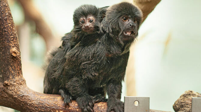 Noch behält Springtamarin-Weibchen Brava das kleine Bündel, das sich an ihren Rücken klammert, ganz für sich. Vier Wochen alt ist ihr Jungtier, mit dem sie im Südamerikahaus der Wilhelma von Ast zu Ast hüpft. Seine Geschwister beobachten den Winzling schon mit großem Interesse. Neugeborene Springtamarine wiegen nur etwa 60 Gramm, die ausgewachsenen Tiere bringen es auf ein halbes Kilo. Sie lassen sich besonders gut bei der täglichen Fütterung um 13.30 Uhr beobachten. (GEA)
