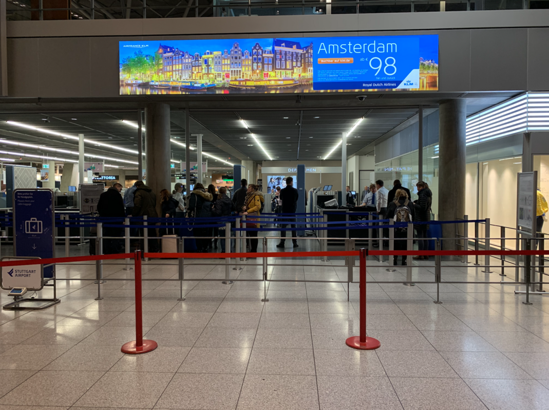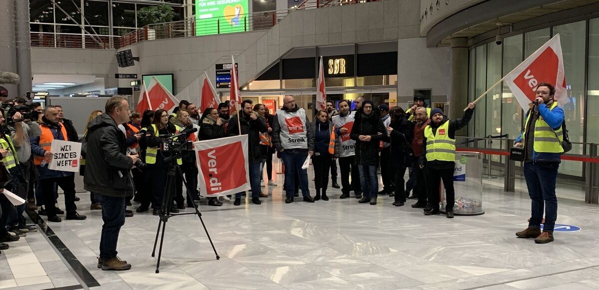 Seit drei Uhr nachts haben die Sicherheitskräfte an den Airports in Köln/Bonn, Düsseldorf und Stuttgart die Arbeit niedergelegt. Am Flughafen der baden-württembergischen Landeshauptstadt sind heute Morgen etwa 150 Streikende mit gelben Verdi-Westen zusammengekommen und machen ordentlich Lärm. Nochmal so viel werden heute Nachmittag erwartet.
