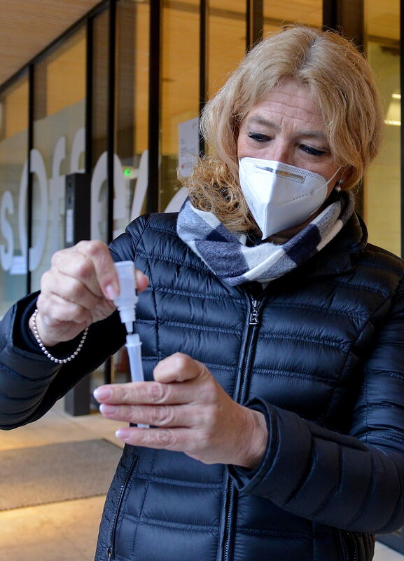 Notärztin Lisa Federle demonstriert in Tübingen einen Corona-Schnelltest. Sie setzt sich für die Ausweitung der Tübinger Teststrategie ein. FOTO: NIETHAMMER