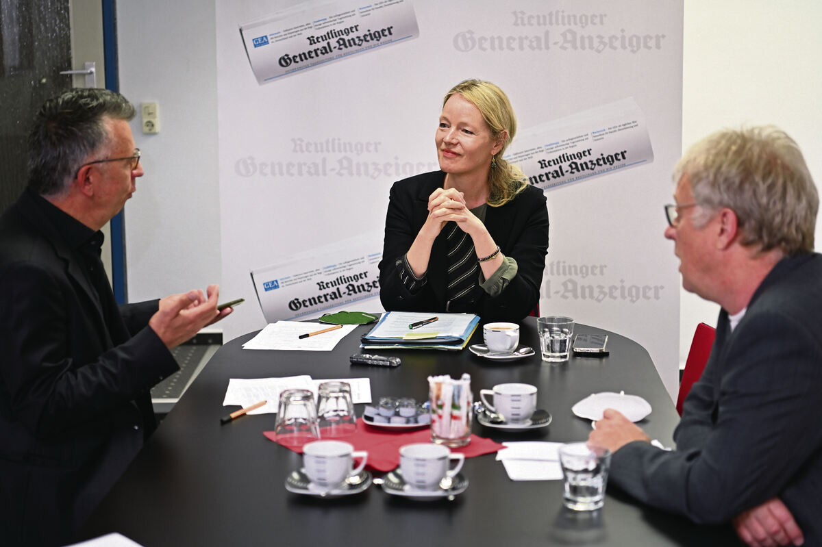 Die neue baden-württembergische Umweltministerin Thekla Walker (Grüne) im Gespräch mit GEA-Chefredakteur Dr. Christoph Fischer (rechts) und Politikchef Davor Cvrlje.