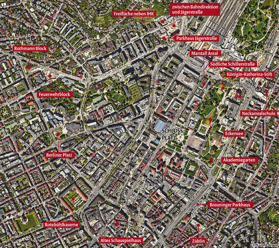 Mögliche Standorte für ein Opern-Ausweichquartier oder einen Neubau. GRAFIK: STN