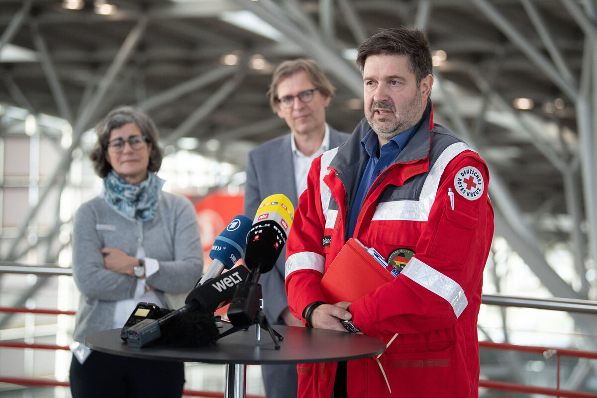 Michael Sieland (von rechts) vom Deutschen Roten Kreuz, Stefan Brockmann vom Landesgesundheitsamt, und Dominique Scheuermann, Leiterin des Gesundheitsamtes des Landkreises Esslingen, informieren über den Umgang mit den China-Rückkehrern. FOTOS: DPA