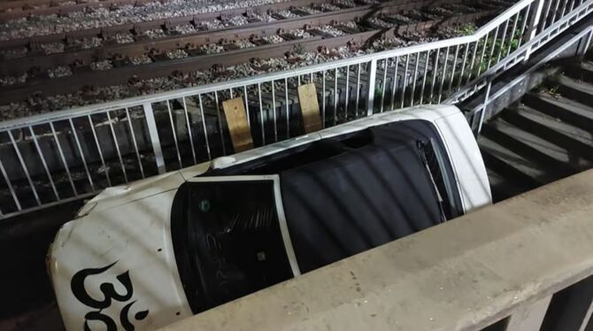 BALINGEN. Es ist ein spektakulärer Anblick, der sich am Donnerstagabend Passanten und Kunden eines Einkaufsmarkts in der Albrechtstraße bietet: Ein Auto liegt auf einer Fußgängertreppe, die an den Gleisen entlang nach unten auf die Bahnhofsstraße führt. Blaulicht erhellt den Nachthimmel. Und schnell gibt es Spekulationen: Hat hier jemand Gas und Bremse verwechselt?