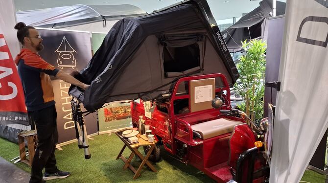 Noch spartanischer wäre es, im Freien zu schlafen: Thilo Vogel klappt sein Dachzelt aus.