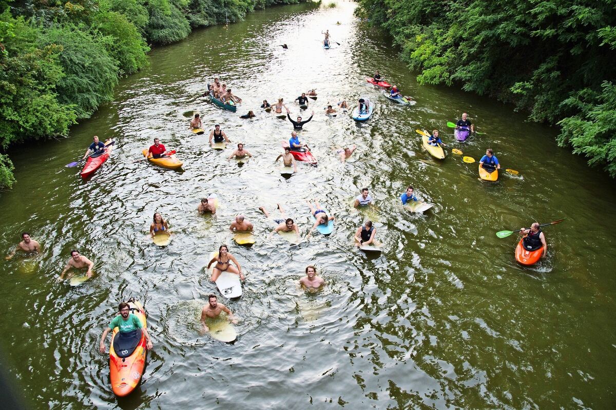 Surfer gehen paddeln: »Paddle up« im Sommer zur Konzeptvorstellung der Neckarwelle in Untertürkheim. FOTO: LICHTGUT/WILLIKONSKY