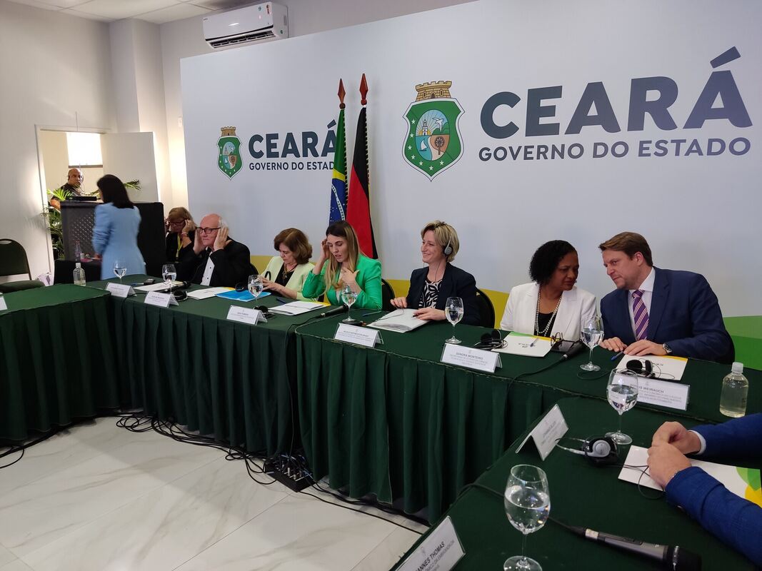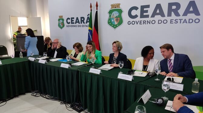 Wirtschaftsministerin Nicole Hoffmeister-Kraut (Mitte) beim Treffen mit der Landesregierung von Ceará. Links neben ihr Vize-Gouverneurin Jade Romero und Ministerin Roseane Medeiros. Ganz links der Landtagsabgeordnete Alexander Schoch (Grüne). Rechts neben Hoffmeister-Kraut die Ministerin für Technologie und Wissenschaft, Sandra Monteiro, daneben der SPD-Abgeordnete Boris Weirauch.