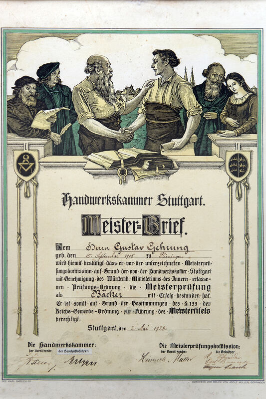 Der obere Teil des Meisterbriefes von Gustav Gehrung aus dem Jahre 1928. Die Bäckerei Gehrung schließt. FOTO: BULGRIN