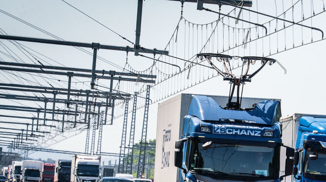 Eine Scania R450 Hybrid Zugmaschine mit Stromabnehmer FOTO: RUMPENHORST/DPA