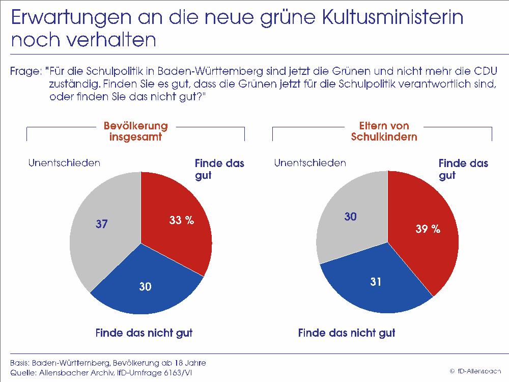 Die aktuelle Untersuchung zeigt, dass sich viele Bürger Baden-Württembergs noch kein gesichertes Urteil über die neue Landesregierung gebildet haben. Dies bietet den Regierungsverantwortlichen die Chance, die Bürger bei ihren Vorhaben mitzunehmen und zu überzeugen. Gleichzeitig steht die Landespolitik immer vor der Herausforderung, dass ihr anders als der Bundespolitik von weiten Teilen der Bevölkerung nur selten große Aufmerksamkeit entgegengebracht wird. (GEA)