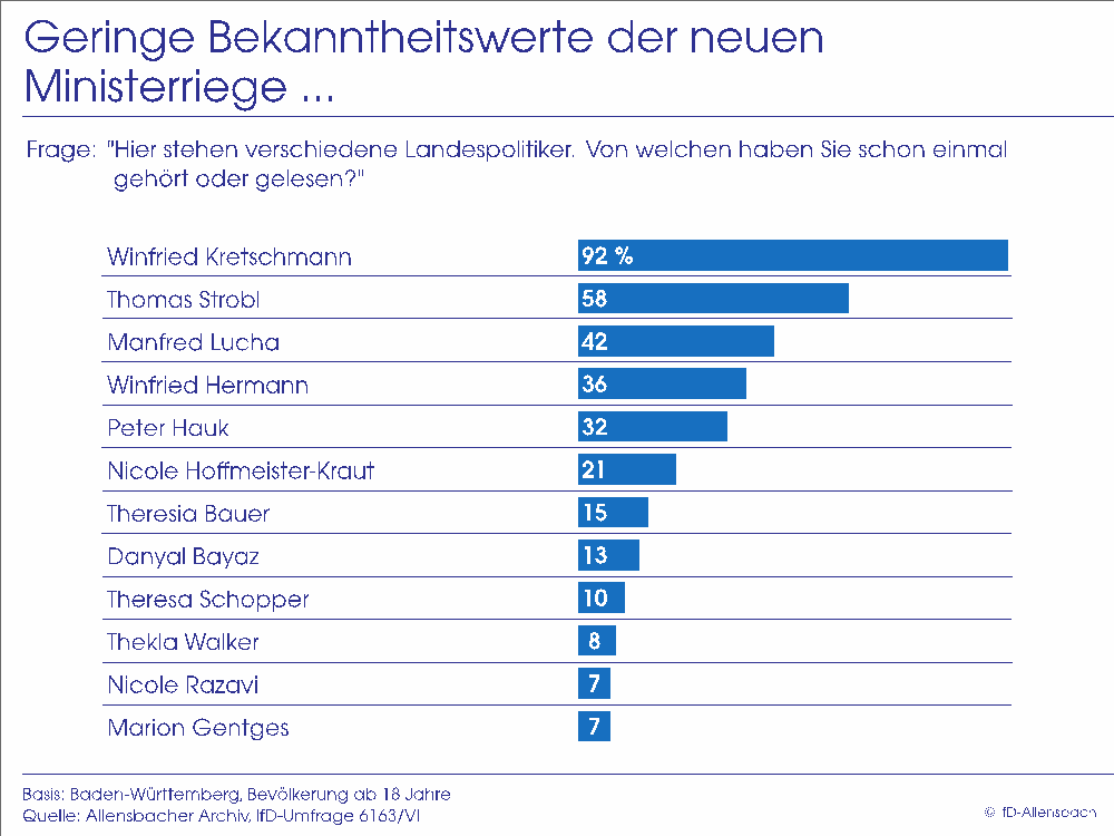 Nach wie vor ist Winfried Kretschmann der mit Abstand bekannteste Landespolitiker Baden-Württembergs. Der Bekanntheitsgrad des Ministerpräsidenten liegt bei 92 Prozent. Mit weitem Abstand folgen zunächst jene Minister, die auch schon der vorherigen Landesregierung angehört haben: 58 Prozent haben schon mal von Innenminister Thomas Strobl gehört oder gelesen, 42 Prozent von Sozialminister Manfred Lucha und 36 Prozent von Winfried Hermann, weitere 32 Prozent von Peter Hauk. Nicole Hoffmeister-Kraut bringt es hingegen selbst nach fünf Jahren Amtszeit als Wirtschaftsministerin nur auf einen Bekanntheitsgrad von 21 Prozent; Theresia Bauer, die bereits seit 2011 Wissenschaftsministerin des Landes Baden-Württemberg ist, bringt es sogar nur auf einen Bekanntheitsgrad von 15 Prozent.