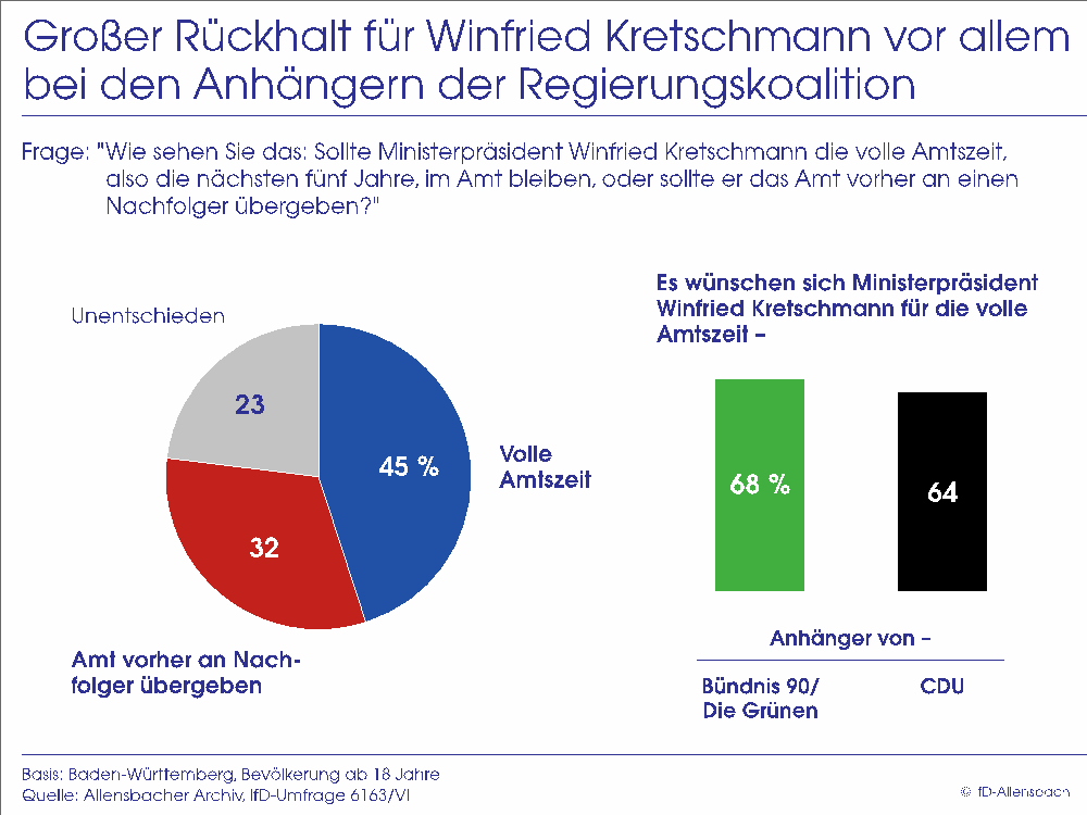 Bereits zwei Jahre vor der Landtagswahl hatte Ministerpräsident Kretschmann bekanntgegeben, dass er bei der Wahl noch einmal als Spitzenkandidat seiner Partei antreten wird. Unklar ist nach wie vor, ob Winfried Kretschmann das Amt des Ministerpräsidenten die volle Amtszeit ausüben oder ob er im Laufe der Legislaturperiode sein Amt an einen Nachfolger übergeben wird. Eine relative Mehrheit der baden-württembergischen Bevölkerung würde es begrüßen, wenn Winfried Kretschmann die volle Amtszeit, also die nächsten fünf Jahre, im Amt bleiben würde. Rund jeder Dritte würde es hingegen vorziehen, wenn er das Amt bereits vorher an einen Nachfolger übergibt. Dass das Meinungsbild so unterschiedlich ausfällt, liegt jedoch vor allem daran, dass die Anhänger der Oppositionsparteien Ministerpräsident Kretschmann lieber heute als morgen in die Pension schicken würden. Bei den Anhängern der Regierungsparteien genießt Winfried Kretschmann hingegen breiten Rückhalt: 68 Prozent der Anhänger von Bündnis 90/Die Grünen und 64 Prozent der Unionsanhänger wünschen sich, dass Winfried Kretschmann die volle Amtszeit als Ministerpräsident im Amt bleibt.