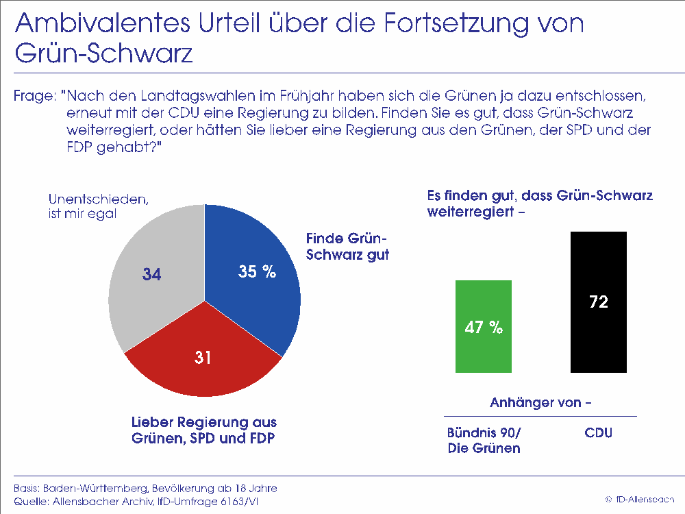 Die Fortführung der grün-schwarzen Landesregierung führt in der baden-württembergischen Bevölkerung zu geteilten Reaktionen. Nur gut jeder Dritte begrüßt die Fortsetzung des Regierungsbündnisses aus Grünen und CDU, knapp jeder Dritte hätte sich lieber eine Ampelkoalition aus Grünen, SPD und FDP gewünscht. Jeder Dritte gibt zudem zu Protokoll, dass es ihm egal ist, wer die neue Regierung bildet. Besonders breite Unterstützung erfährt die grün-schwarze Regierung von den Anhängern der CDU. Von diesen begrüßen 72 Prozent die Fortsetzung der alten Koalition. Die Anhänger der Grünen sind in dieser Frage deutlich gespaltener: 47 Prozent von ihnen befürworten die Koalition aus Grünen und CDU, 41 Prozent hätten sich lieber eine Koalition der Grünen mit SPD und FDP gewünscht.