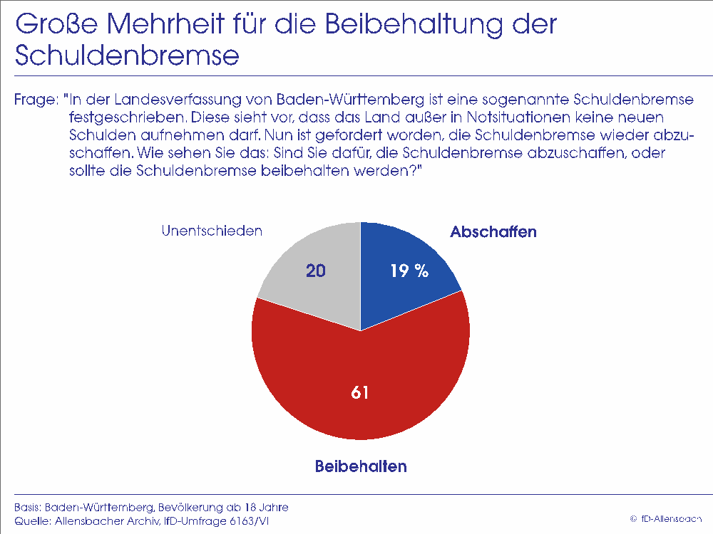 Gleichzeitig spricht sich die große Mehrheit der Bürger gegen die Neuaufnahme von Schulden und für die Beibehaltung der Schuldenbremse aus. Wegen der Mehrausgaben zur Bekämpfung der Corona-Krise wurde die in der Landesverfassung verankerte Schuldenbremse zuletzt immer wieder in Frage gestellt. 61 Prozent sehen jedoch keinen Anlass, die Schuldenbremse ganz generell in Frage zu stellen und plädieren für deren Beibehaltung. Da auch die derzeitige Regelung eine Aussetzung der Schuldenbremse erlaubt, hält die große Mehrheit eine grundsätzliche Abschaffung für nicht angebracht. Lediglich 19 Prozent sprechen sich dafür aus, die Schuldenbremse generell abzuschaffen.