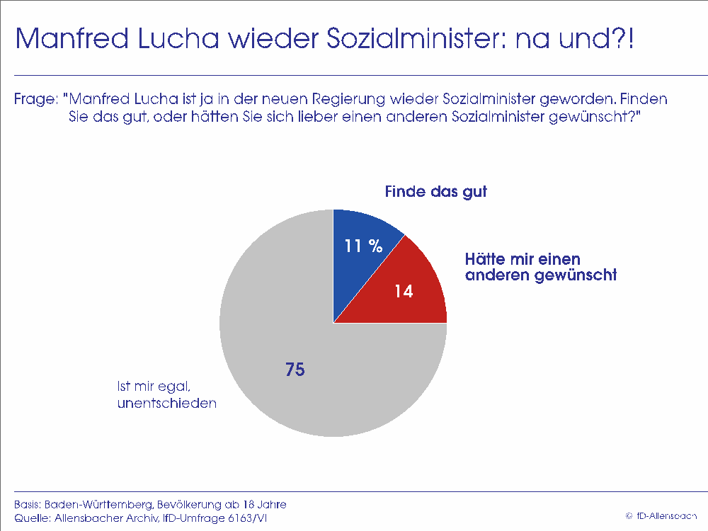 Noch wesentlich drastischer fällt das Urteil in Bezug auf Sozialminister Lucha aus. Dass Manfred Lucha wie schon in der bisherigen Regierung auch im neuen Kabinett den Posten des Sozialministers innehat, interessiert drei Viertel aller Bürger nicht. Das Ergebnis zeigt sehr deutlich, wie wenig sich viele Bürger für Details der Landespolitik interessieren. Aufgrund des geringen Bekanntheitsgrads vieler Landespolitiker fällt es der großen Mehrheit schwer, in Personal- wie Sachfragen ein Urteil zu fällen.