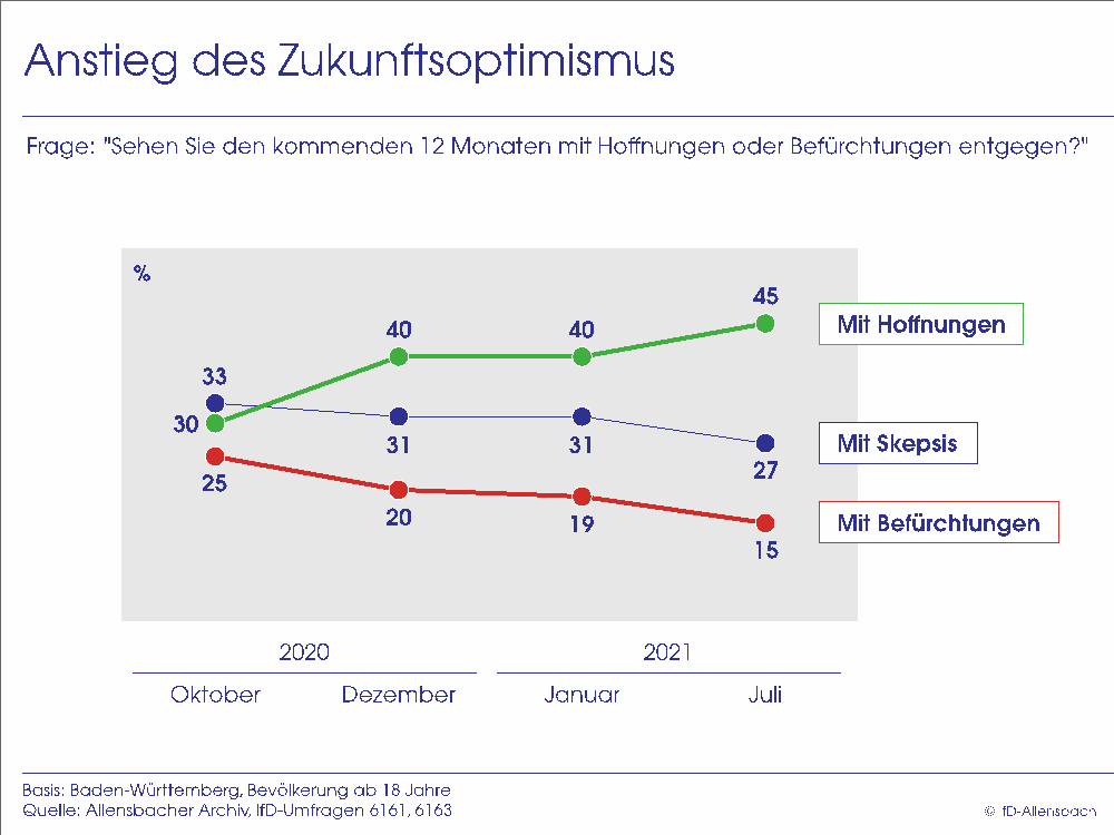Die Stimmungslage in der Bevölkerung hat sich in den letzten Wochen deutlich verbessert. Seit die Infektionszahlen sinken, die Impfkampagne Fortschritte macht und die Rückkehr in ein weitgehend normales Leben greifbar erscheint, wächst der Optimismus in der Bevölkerung. Aktuell sehen 45 Prozent der baden-württembergischen Bevölkerung den kommenden 12 Monaten mit Hoffnungen entgegen, im Winter waren es 40 Prozent, im Spätherbst sogar nur 30 Prozent. Der Anteil derer, die der Zukunft mit Befürchtungen entgegenblicken, ist im gleichen Zeitraum von 25 auf 15 Prozent zurückgegangen, der Anteil der Skeptiker von 33 auf 27 Prozent.