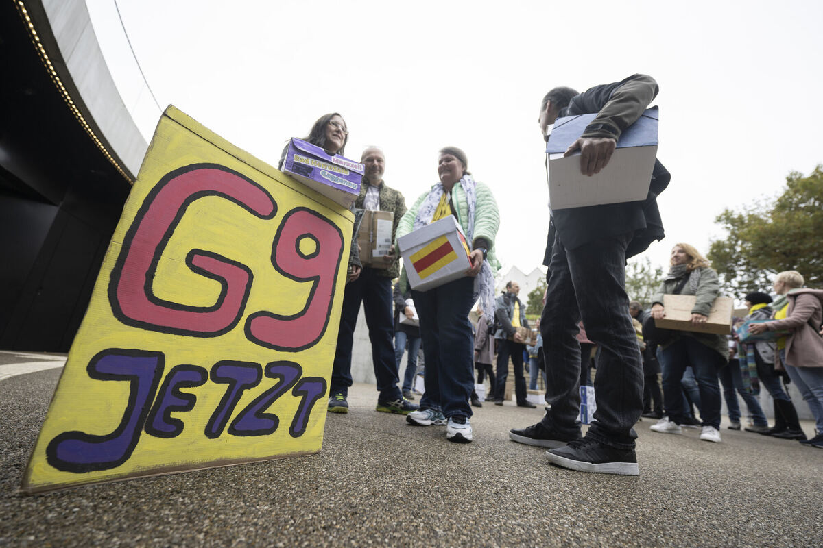 Unterstützer der Elterninitiative »G9 Jetzt! BW« im Oktober vor dem Eingang des Bürger- und Medienzentrums des Landtags von Baden-Württemberg. Foto: Murat/dpa