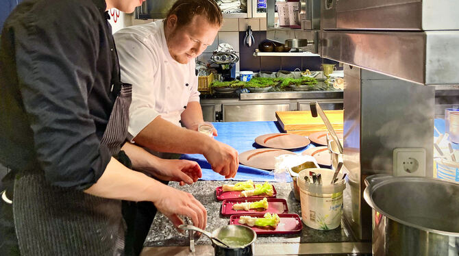 Felix Bogenschütz (links) und Florian Heinrich bereiten in der engen Küche den wilden Blumenkohl zum Fisch vor.