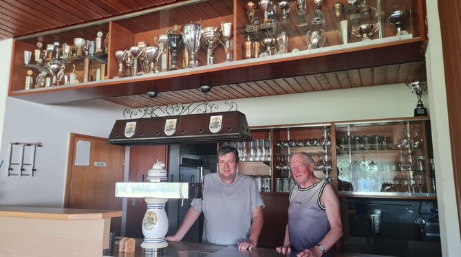 Die Pokale überm Tresen erinnern an frühere Siege, hinterm Tresen steht schon seit einigen Jahren kein professioneller Gastronom mehr. Alexander Müller (links) sucht als Vorsitzender mit seinen Vereinskameraden nach neuen Ideen für die Zukunft. Helmut Dollinger hat vor über 50 Jahren das ehrenamtliche Team, das das Sportheim gebaut hat, angeleitet und koordiniert.