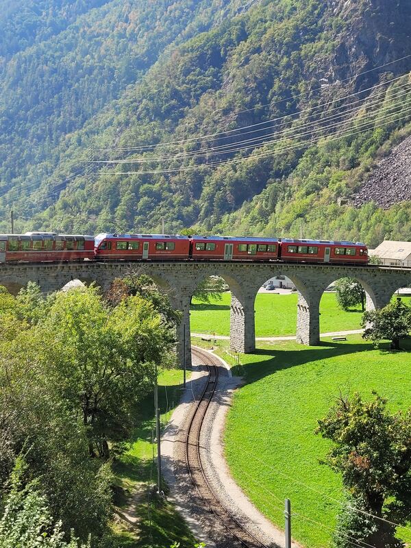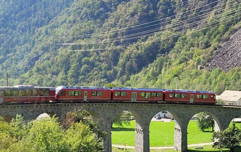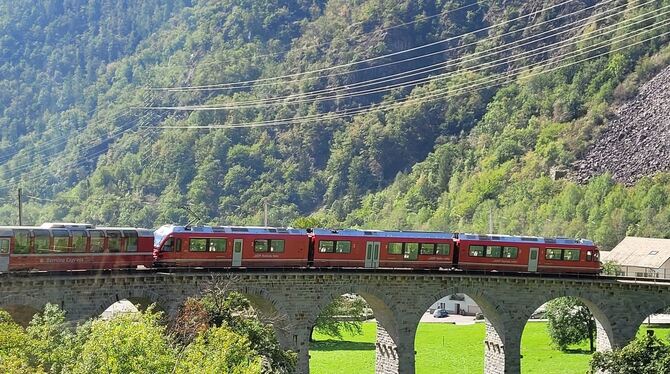 Am nächsten Tag ist es dann so weit: Im Bernina Express fährt die Gruppe von Tiefencastel über die italienische Grenze nach Tirano. Von den Gletschern zu den Palmen verläuft die spektakuläre Strecke der roten Schmalspurbahn. Im Panoramawagen genießen die GEA-Leserinnen und -Leser die abwechslungsreiche Aussicht. Mit dem Landwasserviadukt bei Filsur, Bernina- und Albulapass sowie dem Kreisviadukt von Brusio sind nur einige Höhepunkte der Fahrt genannt. Die Rückfahrt erfolgt per Bus über den Bernina- und Flüelapass. Wer hier oben im September mit Schnee gerechnet hat, wird enttäuscht, T-Shirt-Wetter ist angesagt.