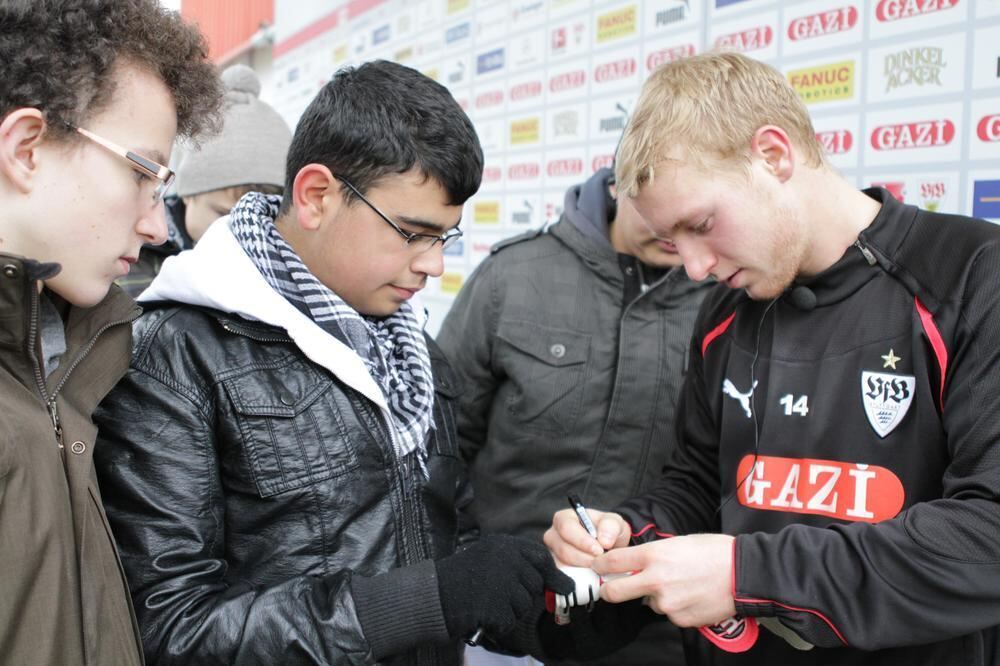 Es waren auch viele Kamerateams da, die einige von uns während des Trainings interviewt haben. Ein paar Jungs wollten unbedingt ein Foto mit sich und dem Originalball ergattern und hängten sich deswegen sogar über die Bande. Das Training endete mit einem Trainingsspiel. Nach dem Training bekamen wir noch Autogramme vom VfB-Superstar Camoranesi und dem Chef-Trainer Keller. Außerdem durften wir noch Fotos mit den Stars machen. Beim Interview mit Patrick Funk erfuhren wir, dass er von seiner Tante entdeckt wurde.Außerdem, dass sein Traumverein eigentlich der VfB ist, aber ein Angebot von »Barca« oder »ManU« auch reizvoll wäre. Auch interessant fanden wir, dass er mit drei Jahren schon anfing Fußball zu spielen. Seine Vorbilder sind die Spieler des VfB, die dort auch schon - wie er - seit der F-Jugend sind.