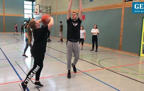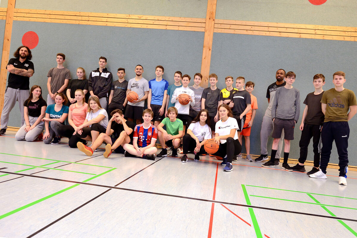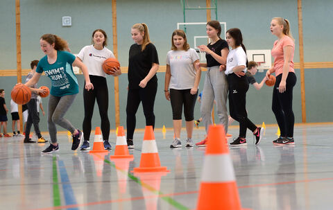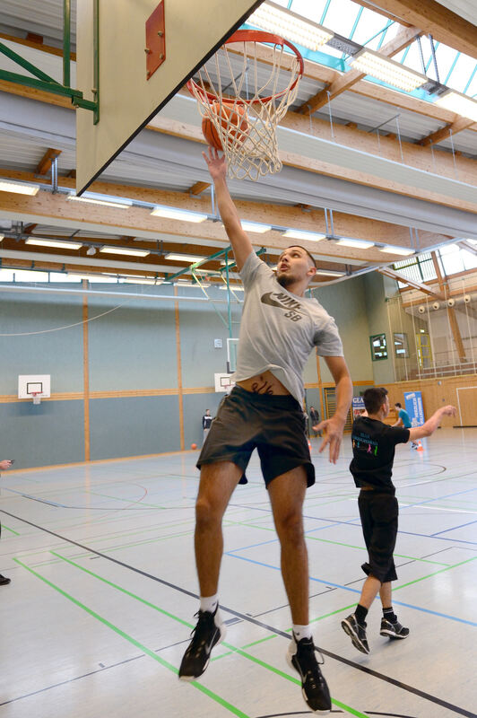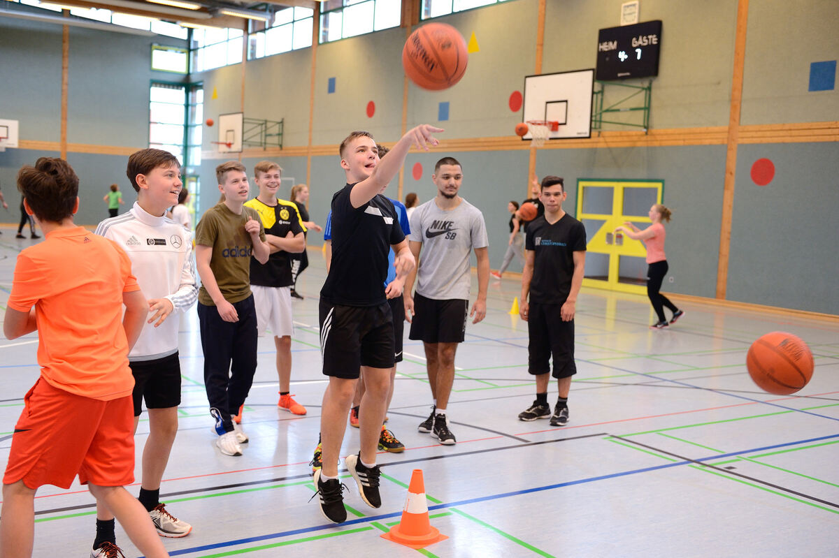 Für das darauffolgende Spiel wurden die Schüler in drei Gruppen eingeteilt. Bei dem Spiel, bei dem die Schüler den Umgang mit dem Basketball üben konnten, mussten sie den Ball prellend im Slalom um die Hütchen bewegen und am Schluss versuchen, mit dem Basketball in den Korb zu treffen. Dann gab es noch ein Match zwischen einem Profi und jeweils einem Schüler, bei dem sich alle so richtig austoben konnten.