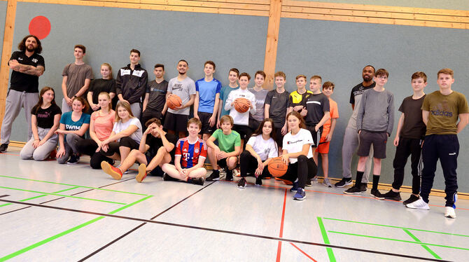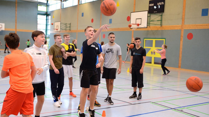 KIRCHENTELLINSFURT. Die drei Basketballer Nemanja Nadjfeji (18 Jahre), Elijah Allen (29 Jahre) und Aaron Brennan (23 Jahre) von den Tigers Tübingen besuchten mit dem Jugendtrainer Manuel Pasios die Graf-Eberhard-Schule in Kirchentellinsfurt, um den Schülern bei einem exklusiven ZmS-Training das Basketballspielen näherzubringen.
