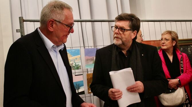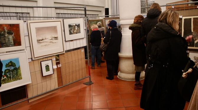 Den ganzen Donnerstag und Freitag waren dann Eckhard Raisch und Wilfried Thron damit beschäftigt, die Kunstwerke auf zwei Stockwerken im Spitalhofgebäude zu platzieren. Schlussendlich waren rund 300 Bilder in der Preisspanne zwischen 60 und 3.000 Euro aufgehängt, darunter Ölgemälde, Druckgrafiken, Aquarelle, Lithographien und Holzschnitte: »Ich finde es großartig, dass Sie zu dieser ganz besonderen Veranstaltung so zahlreich erschienen sind«, freute sich Finanzbürgermeister Roland Wintzen und wies in seinem Grußwort darauf hin, dass die Zinseinnahmen (7.000 Euro) der Oskar-Kalbfell-Stiftung gegenüber den letzten Jahren wieder etwas zugenommen hätten. Das sei aber »bei weitem noch nicht genug«. Immerhin konnten dieses Jahr 20 Anträge für begabte Kinder aus Reutlinger Familien mit geringem Einkommen bewilligt werden, berichtete der Finanzbürgermeister. Ausdrücklich bedankte er sich bei denjenigen, die Kunstwerke zur Verfügung gestellt hatten sowie bei den Organisatoren und dem Förderverein des Lions-Clubs.
