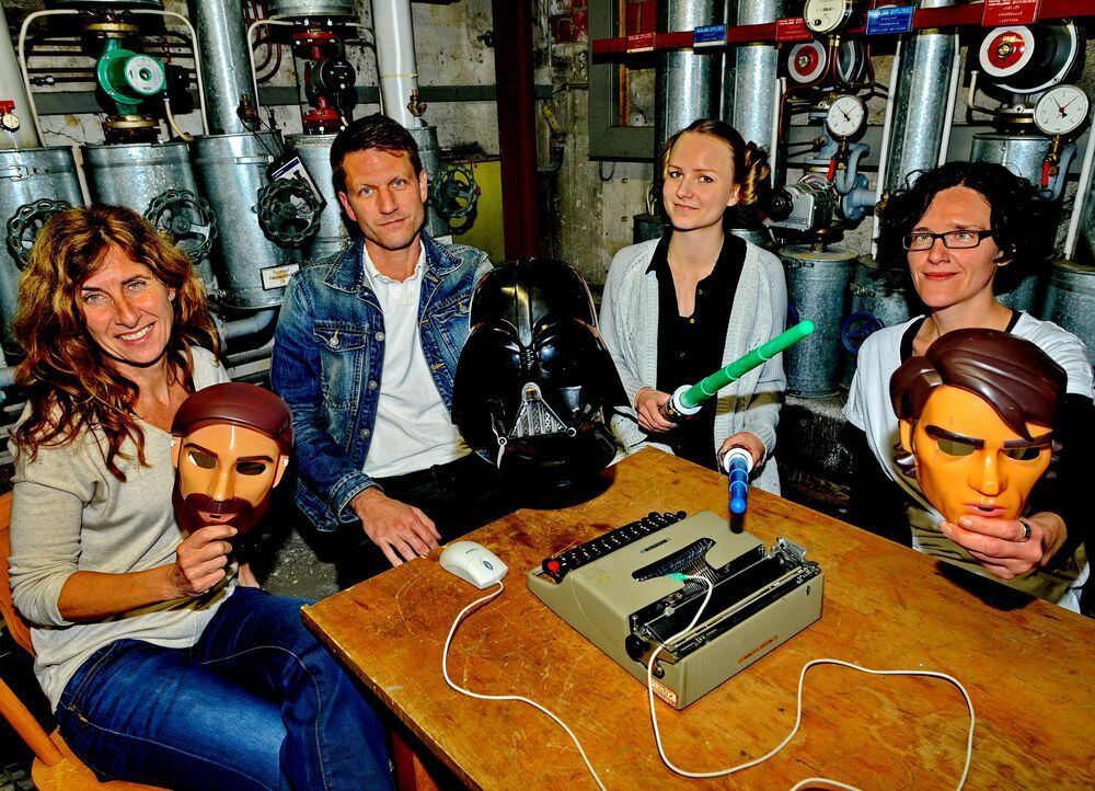 Die Maske ist runter, das ZmS-Team verabschiedet sich im Maschinenraum des GEA-Raumschiffs von Schülern, Lehrern und Lesern. Im Bild (von links): Karin Dengel, Andreas Fink, Sarah Steen und Marion Schrade. FOTO: NIETHAMMER