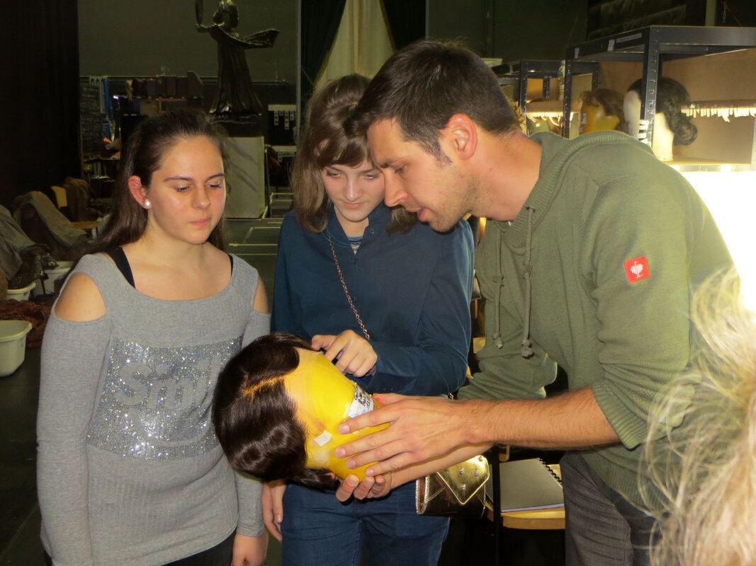 Techniker Lars Schemmerling erklärte uns die Schritte, die vor einer Aufführung durchgeführt werden müssen: »Funktionieren alle Lampen? Passt der Ton? Ja! Dann kann es losgehen.« Falls während der Show etwas kaputt geht, gibt es für alles einen Backup-Plan. Das heißt, alles gibt es doppelt, damit die Zuschauer nicht mitbekommen, wenn etwas schiefgeht. Besonders erstaunt waren wir von der großen Bühne, von welcher wir als Zuschauer nur ein Viertel der eigentlich 1 000 Quadratmeter sehen. Hinter der Bühne müssen die Darsteller sich teilweise in 20 Sekunden umziehen. Daher hat jedes Teil seinen eigenen Platz, sogar jeder Handschuh und jedes Paar Socken. Alle Kleidungsstücke sind maßgeschneidert, deshalb müssen die Darsteller regelmäßig zum Fitting. Die Kleider waren toll. Einige durften wir sogar anfassen.