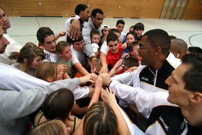 »SAUBER«: Jede Menge Tipps gibt's beim Training von den Profis unter den Basketball-Körben. Und wenn jemand einen Korb wirft, geizt Basketballer Jüfan Geiger nicht mit Lob: »Sauber.«