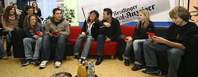 OHNE ENDE: Zwei Stühle, darauf ein riesiger Stapel Karten, dahinter ein Haufen Schüler - mit Autogrammwünschen ohne Ende. Mariangela und Angelo dürfen keine Sekunde verschnaufen, die »VL«-Stars werden fast eine Stunde lang umzingelt. Jeder will Minimum fünf Autogramme - für die Freundin, den Onkel, die Eltern, die Schwester, die Mutter, und, und, und . . . (GEA)