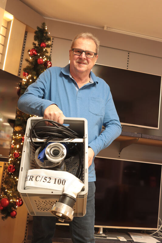 Dieter Redemann zeigt die Unwetterbox: Mit einer Pumpe und einem 15 Meter langer Feuerwehrschlauch kann jeder selbst Wasser aus dem Keller pumpen. FOTO: WALDERICH