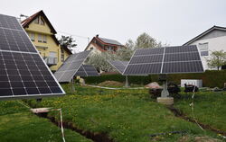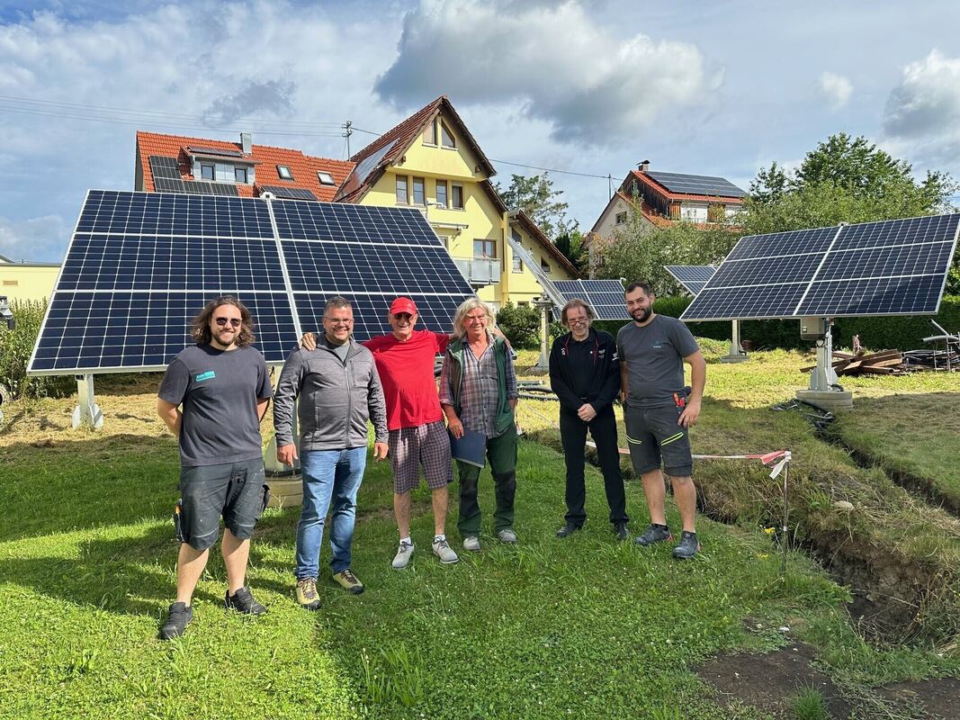 Die Genehmigung für den Solarpark ist da. Die Handwerker Hartmut Hirsch (dritter von rechts) und Simon Gutberlet (zweiter von links), Uwe Föll (zweiter von rechts) und zwei Mitarbeiter freuen sich zusammen mit Willi Kemmler (mit roter Mütze).