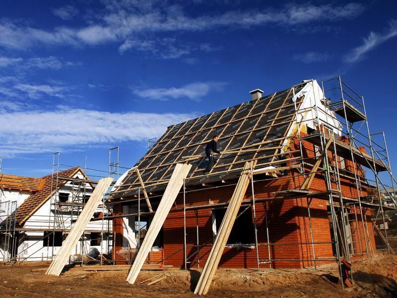 Dachdecker arbeiten in einem Baugebiet an einem Eigenheim. Foto: Jens Büttner/Archiv