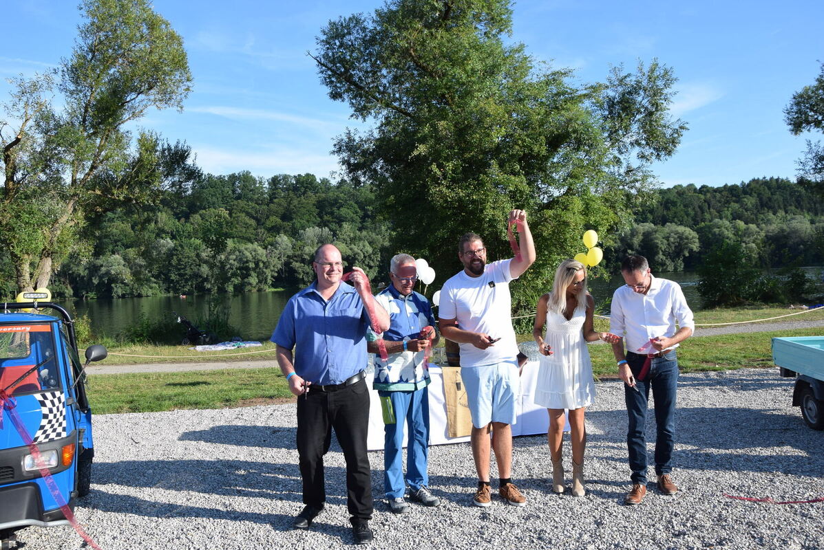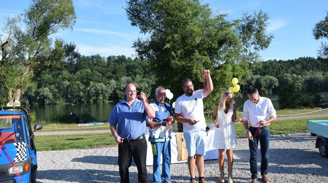 Da schien noch alles eitel Sonnenschein zu sein. Von links: Gerd Schwarz vom Fischereiverein, Hans-Erich Messner (lange Stellvertreter des Landrats), Clemens und Vildana Vohrer und Bürgermeister Bernd Haug bei der Eröffnung des Gastro-Betriebs im August 2022.